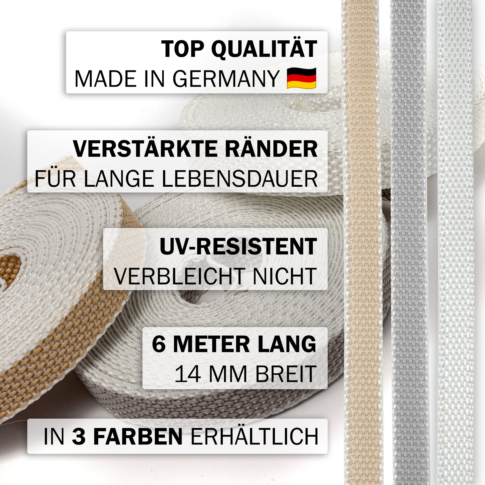 Das Gurtband ist UV-stabil, was bedeutet, dass es selbst bei intensiver Sonneneinstrahlung seine Farbe und Festigkeit behält und nicht brüchig wird.